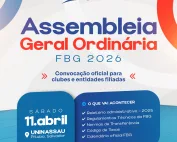 A Federação Baiana de Ginástica (FBG) tem a honra de convocar os clubes e entidades filiadas para a Assembleia Geral Ordinária, que acontece no dia 11 de abril, na Uninassau, localizada no bairro da Pituba, em Salvador.